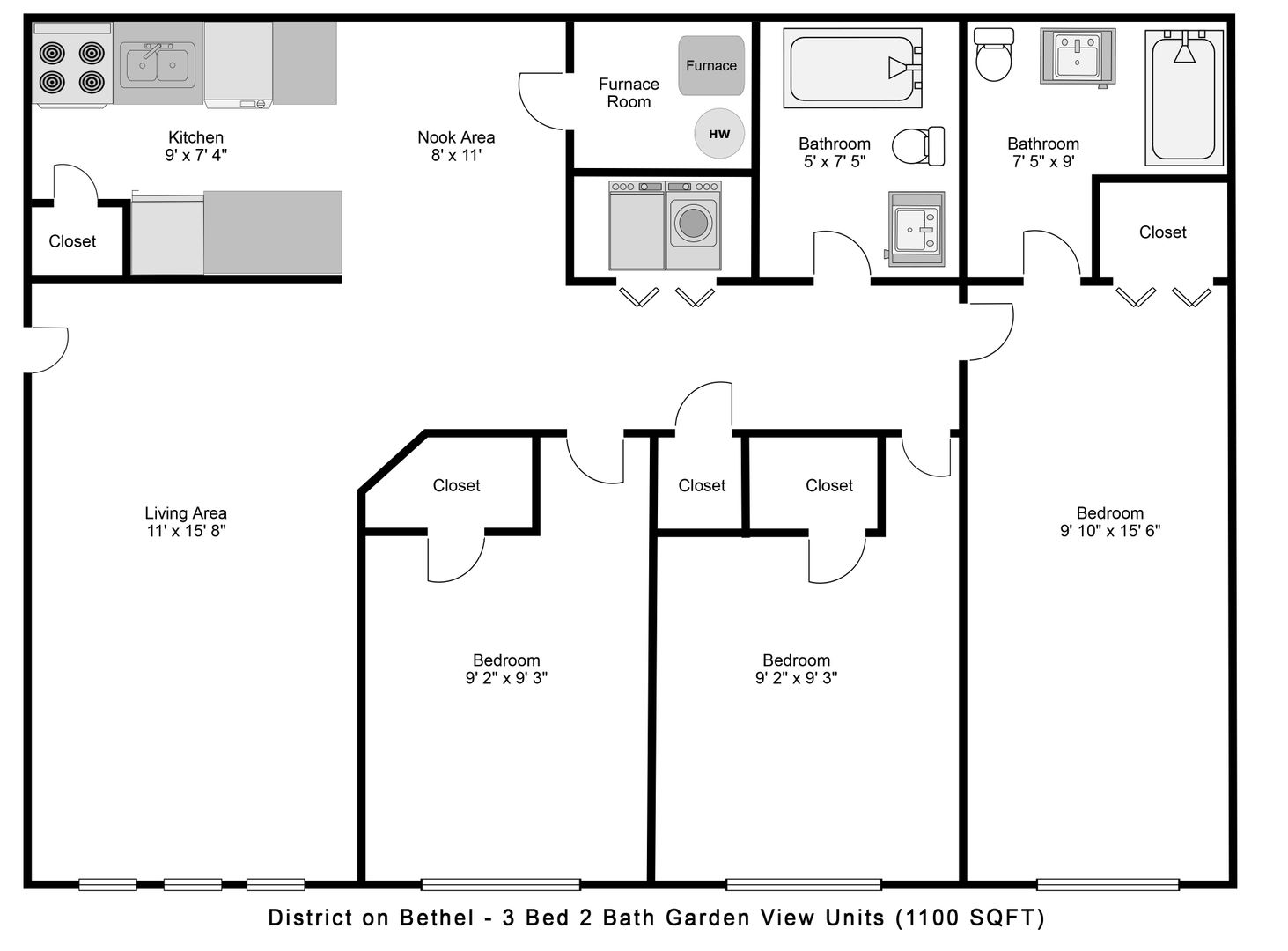 Welcome to our newly renovated District on Bethel - South Tower, where you'll find exquisite 3-bedroom, 2-bathroom units. These units are thoughtfully designed to provide a comfortable living experience. Step into a world of modern aesthetics as these units boast brand-new vinyl flooring, stylish kitchen cabinets, pristine windows, a rejuvenating bathtub, a sleek toilet, and an elegant vanity.